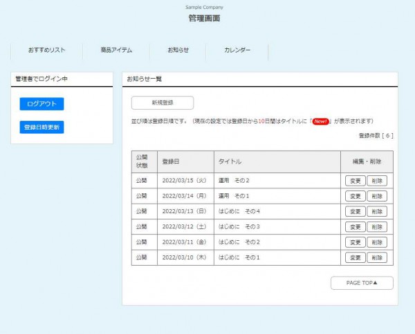 このサイトにはシンプルなブログ機能がついています。お知らせなどは管理画面から記事を投稿できます。
